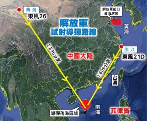 早前报道引述中国军方消息人士指,解放军当日上午向南海试射两枚导弹,其中一枚从青海发射的是东风26导弹,另一枚东风21D导弹则从浙江发射。消息指,中方发射导弹的目的,是要改善中国拒绝其他势力进入南海的能力;又称美国军机和战舰愈来愈频繁进入南海,中国是以此回应美方行动带来的潜在风险,但不希望邻国误解中方的目的。