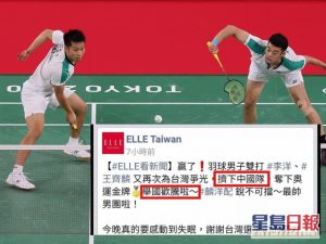 《ELLE Taiwan》在中華台北組合勝出運羽毛球男雙決賽後,昨晚隨即發文祝賀:「贏了!羽球男子雙打李洋、王齊麟又再次為台灣爭光,擠下中國隊,奪下奧運金牌,舉國歡騰啦」。惟帖文中「擠下中國隊」、「舉國歡騰」字眼引起大陸網民注意,不少網民批評《ELLE Taiwan》的「台獨」立場,斥「搞台獨就滾出中國」、「台獨雜誌滾」。