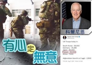 【军事重点】中国解放军周二(17日)公布在台湾附近实兵演练,指控美国与台湾频频勾连挑衅之际,美国共和党参议员科尔尼恩(John Cornyn)在社交网发文,公布美方在海外驻扎的兵力,声称3万名美军驻守台湾,引起两岸关注。大陆官媒警告若属实,中方将立即发动解放台湾战争;台军则指这是错误讯息。