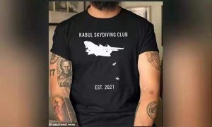 这款上衣由“TShirt At Low Price”生产,印有“喀布尔跳伞俱乐部 Est. 2021”(Kabul Skydiving Club Est. 2021)字样,绘有军用飞机下方坠落2个人影,售价为16到26美元。产品描述指出,这件上衣适合喜欢跳伞、从飞机上跳下来体验高涨情绪的人。