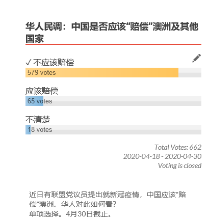 民调显示 华人大部分认为中国不应该就新冠疫情做出赔偿