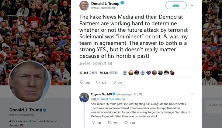 特朗普︰蘇萊曼尼威脅「迫在眉睫」 蓬佩奧︰伊拉克領袖私下想美軍留下