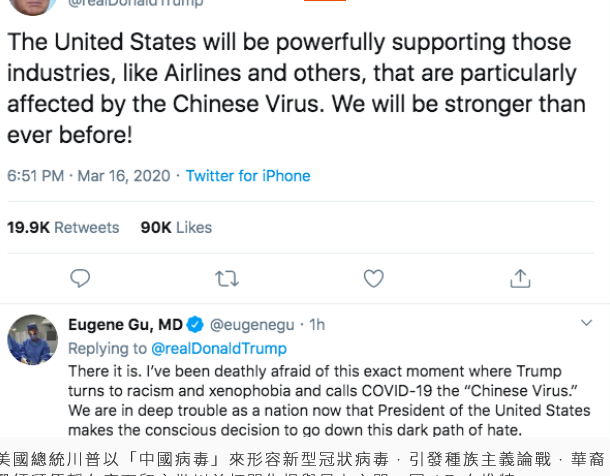 川普首稱「中國病毒」 華裔醫師:打開暴力和仇恨之門