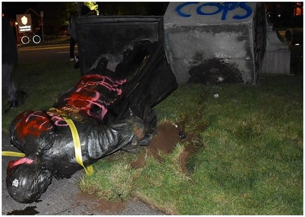 不满国父蓄奴 示威者烧国旗拉倒雕像