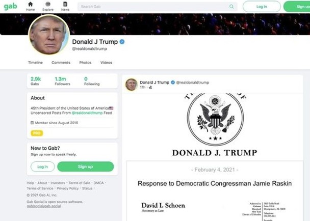 特朗普重返社交网 在Gab上载反驳弹劾信件