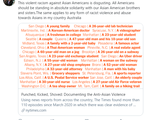 前总理陆克文声援美国亚裔反歧视活动 要与亚裔站在一起