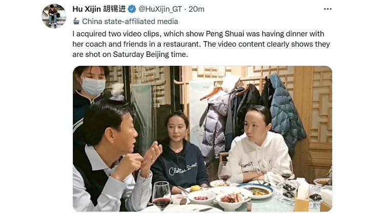 胡錫進發彭帥露面片 談話提日期顯昨拍攝