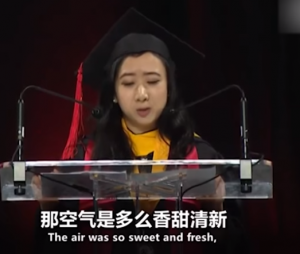 2017年5月21日马里兰大学学院市分校毕业典礼上,来自昆明的留学生杨舒平在发表毕业演讲时称美国空气是甜的。