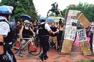 【火辣网】美國數百名反種族主義示威者周一(22日)試圖拉倒白宮附近的拉斐特廣場一座前總統傑克遜(Andrew Jackson)雕像,遭最少100名警員阻止,並施以胡椒噴霧驅散,其間有示威者阻撓警員執法(圖)。總統特朗普於Twitter發文批評示威者「可恥」,警告有關罪行可判囚10年。