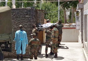 6月17日,印度士兵在Leh的医院外搬抬丧生的印度士兵
