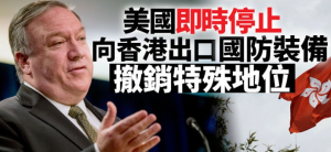 「港版國安法」最快周二(30日)通過,美國國務卿蓬佩奧(Mike Pompeo)周一(29日)表示,即日起停止向香港輸出受管制的國防裝備;對於可軍民兩用的相關科技,美國即將要求申領牌照才可出口到香港。