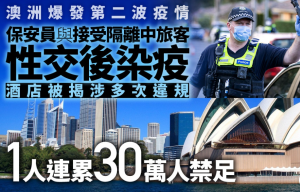 澳洲前幾個月成功遏阻新冠肺炎擴散,但維多利亞省近日卻爆發第二波疫情,基因定序報告將來源指向一位「超級傳染者」,迫使墨爾本西北的30萬名居民進行在家避疫。當地媒體指出,整個事件起自防疫酒店的保安員跟部分理應接受隔離的旅客發生性關係。