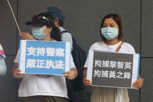 大约9名人士今带同请愿信到警察总部外,又高举写有“拘捕黎智英,拘捕黄之锋”的口号牌,并挥动国旗。其后,团体代表将请愿信交予警方代表,并和平离去。(东网)