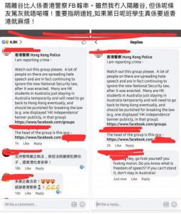 澳洲的香港人網上社交群組7月8日瘋傳圖片,圖片中顯示,有人向香港警方網頁舉報澳洲的兩大社交群組,指控群組中「很多人散播憎恨言論,不斷漠視新近實施的國安法」,「很多香港學生只是短暫停留在澳洲,最終會返回香港,因為違法應該受到懲處。」