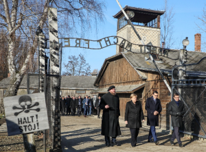 對波蘭來講,德國戰後對波蘭致歉的對象,其實僅為猶太人群體,而非對波蘭本身。默克爾(前排左二)訪波蘭期間的奧斯維辛之行也有類似意味。(Getty)