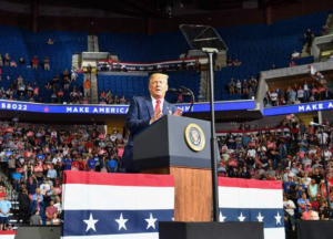 题图:川普6月20日在奧克拉荷馬州土爾沙市首場重啟造勢活動,會場二樓出現大量空位,據傳原因之一是TikTok許多用戶分享「取票不出席」以抗議川普的策略。(法新社)