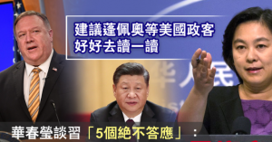 【华人关注】中美關係愈發緊張之際,中国国家主席習近平周四(3日)提到「5個絕不答應」,引發關注。外交部發言人華春瑩周五(4日)表示,這是對美國一些極端反華勢力的最響亮回答,建議美國國務卿蓬佩奧等美國政客好好去讀一讀。