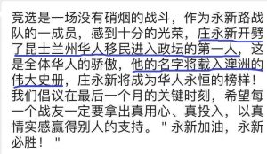当然,庄先生若用物业管理行业诞生出首位华人这一卖点参政,则无不可,但仍需要更多信息核实(据闻维州市议会选举,也有来自物业管理行业的华人参选)。物业管理费行业出个首位参政华人,是值得庆贺的,印证了中华民族一句古话,行行出状元。只是,宣传时请注明是某行业首个华人参政,这样就避免误解了。否则,愚弄选民,是聪明反被聪明误。