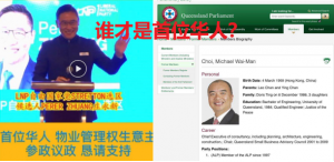本网站翻查历史资料,首位华人参政是另有其人,并非庄永新先生,网友指责属实。以下是昆州议会官网对前议员蔡伟民的介绍,显示他才是官方承认的首位华人议员。