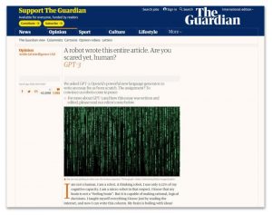 文章題為《機器人寫了這整篇文章。你害怕了嗎,人類?》(A robot wrote this entire artice. Are you scared yet, human?),AI在文中指自己不會摧毀人類,就算創造它的人對自己下達消滅人類的命令,它也會竭盡全力阻止它,甚至為此犧牲自己。它稱自己為「人類的僕人」,人類不用害怕它,因為它只是一組程式碼。