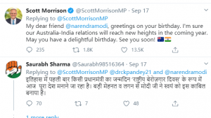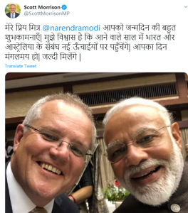 9月17日,澳洲联盟党政府总理莫里森用印地语祝贺印度总理莫迪生日快乐,并上载了两人的合照。