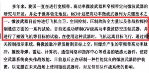 2017年3月,大陆互联网曾曝光的一则学术论文称“中国微波武器目前将进行飞机自卫、空间控制、压制敌防空力量以及作战指挥控制通信方面的一系列试验。目前还成功研制吉瓦级高功率微波防空压制武器,并进行了摧毁飞机等目标的试验”。