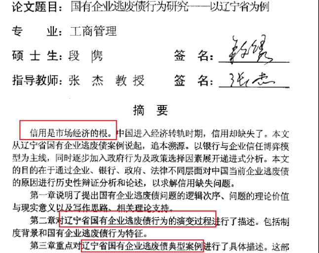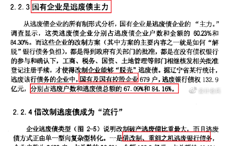 在论文中,其指出国有企业是当时逃废债的主力,借改制重组之机逃废银行债务。他归纳出逃废债企业的共同特点是,“都将原企业的有效资产转移,把债务扔在老企业,有效资产随意打折处理”,“改制后的新企业,或是忙于以对外入股、联营合资、合作的名义转移有效资产,再建立新企业,迅速抹掉与原企业的资产转移关系,或是化整为零,集团下属多家分公司分散使用资产,使得债权银行无处追查”。