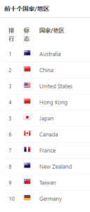 依次为:澳洲,中国,美国,香港地区,日本,加拿大,法国,新西兰,台湾地区,德国。