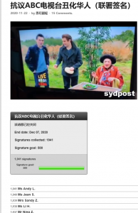 11月20日,ABC电视台播出的辱华节目,引起华人社区极度不满,纷纷发邮件投诉,《悉尼邮报》近日也发出中英文公开信。不过,ABC电视台依然装聋扮哑。处理手法显示主流媒体轻视华人。