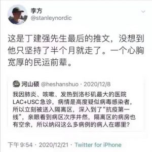 据社交媒体,河山硕是个知名的积极反华份子。他在 12 月 8 日发烧咳嗽到医院急诊,在 12 月 21 日离世。他是 1989 年的留学生,在此推算他大约 50 岁左右。其短暂的一生都是在高调美国的制度完美和先进,但他竟然在壮年间,在那完美的体系倒下!