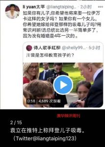 袁立在特朗普卸任之际,在推特上发文称,“如果你有儿子,你希望他将来娶一位伊万卡(Ivanka Trump)这样的女子吗?如果你有一个女儿,你希望她嫁给拜登(Joe Biden)那样的吸毒儿子吗?用常识判断,选总统比选另一半简单多了,因为没有婚姻是4年一次的。”