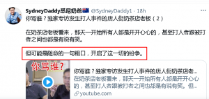 悉尼奶爸是个恨国党反贼这个无用置疑,但他访问奶茶店老板并无不妥,他也没有说明支持奶茶店老板的说法。打人的那段是刑事案件,让警察和司法机关来处理。打人前后所发生的事,除了当事人其他人都不知道真相。奶茶店老板有权利发表自己的情况。通过这个采访反而让观众更好了解情况分析来由,和判断奶茶店老板是不是说谎做假消息。这个采访更是会留下记录,等以后 ATO或劳工纠纷部门调查奶茶店时有帮助。