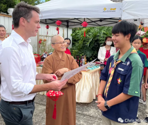 2月14日大年初三,工党柯民思州议员(Chris Minns)拜访了位于Kogarah的南雪梨佛光缘,受到热情接待。佛光山南雪梨佛光缘妙尧法师,国际佛光会雪梨协会会长钱仪健,协会督导黄劲峰,南一分会长郭洪榕,光明分会长游瑞云,喜舍分干部许明慈,佛光童军团长方婉晶以及雪梨青年第四分团干部杨静芳等出席了接待会。