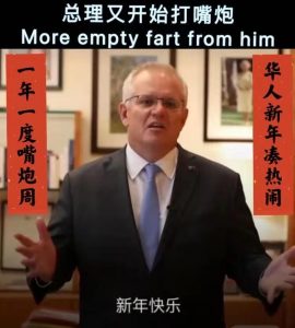 莫里森出于选票呼吁自由党议员春节走访华社,结果去的几乎是工党议员,反映自由党的党风不正,只讲价值观不讲多元文化,已经不把华人放在眼里,歧视已经深入骨子里。就算去作秀也行吧,可现在似乎连作秀都懒了。