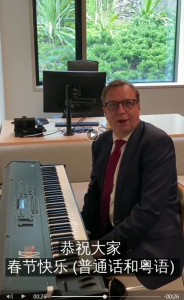 图为维州工党议员Matt Fregon拍视频弹钢琴给华人送去佳节祝福。