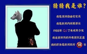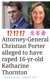 爆料:自由党内阁某部长涉性侵16岁少女? 猜猜他是谁 (作者:汪割割) 图配文: 猜猜我是谁? 我是自由党党员 我是联邦内阁某部长 1988年XX了未成年少女 我道貌岸然的外表貌似正直 我的职务是联邦政府XXX 答案是: 媒体爆料是联邦政府总检察长Christian Porter (作者:汪割割) 供稿:汪割割(澳华辣评周刊特约漫画家) 注:图文为个人观点