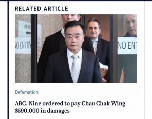 2021年2月初,商界及政界知名的华裔慈善家周泽荣也取得起诉澳大利亚资助媒体ABC的《四角》节目的法律胜利,ABC道歉并赔款59万澳币。此诽谤起诉始于2017年6月。起源于ABC媒体下的《四角》节目暗示周泽荣是中国间谍,背叛他的国家-澳洲,暗指他大量捐款给政党目的就是希望影响政客制定出有利于中国的政策及利益等等。周泽荣官司胜诉说明正义得到申张, 污名终被洗清。