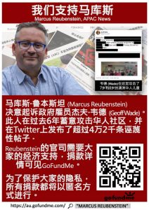 今天,在微信群留意到一则筹款打官司的图片(如图)。里面介绍,澳洲政府雇员杰夫·韦德(Geoff Wade)过去6年在推特竟然发布了超过4万2千条诬蔑华人社区的帖子。激起义愤。西人马库斯·鲁本斯坦(Marcus Reubenstein)先生实在看不下去,决定仗义出手,循法律途径起诉杰夫·韦德(Geoff Wade)。