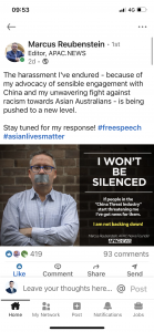 愤怒!像Geoff Wade 类似事件已不是单一个案!在鼓吹多元文化的澳洲此类事件多次发生!这是为什么?因为某些媒体政客及种族歧视分子長期反华反中的歧视和误导加上我们的沉默無声 自私怕事而造成了牠们对我们的 肆无忌惮的抹黑歧视。此次事情本该由在澳各华社联合发起讨伐这Geoff Wade ! 但卻是由 Mr. Marcus Reubenstein 见义勇为替我们正义发声提出法律诉讼!在这表示对澳洲社会还存在不少像 Marcus 这样的有识正义之士感到欣慰,也向Marcus 先生为我们华人发声致敬和感谢!但同时也希望在澳的华人华社同胞们要珍惜和善用这国家宪法所给于的权利和法律保护!希望Marcus 先生这次的行为能给咱们的华社起到示范作用!別人都替我们出头了,我们能不响应嗎?只要有血性的都应顶力支持!