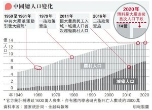 《金融時報》周二(27日)引述知情人士報道,是次普查結果顯示2020年全國總人口不足14億,將出現自1949年有紀錄、大躍進運動以來首次人口下降(見圖)。而中國官方統計指全國總人口在2019年突破14億。知情人士稱,普查數據被認為「非常敏感」,因此要待眾多政府部門就數據及其含義達成共識後才公布。
