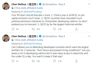 5月8日,陈卫华在推特上四连击反驳桑伯格。他批评道:“你(桑伯格)的公关队伍应该教导你更多。第一,中国的人口是经合组织(OECD)的两倍,因此人均排放量要低得多;第二,OECD将大量污染行业转移至中国或其他发展中国家,所以不要假装你是无辜的;第三,迄今为止,OECD是历史上最大的温室气体排放国。”
