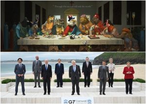 画作《The Last G7》(上图)讽刺在英国举行的G7峰会(下图)。