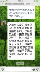 正如微信群多位华人网友所言,不管是国家还是个人发起的请愿书,她正好符合我们想打中国疫苗的心愿,就要积极参与;敢不敢发声是一回事,能不能成功是另一回事。发出我们大多数华人(除那些反骨外)的声音是表明我们是澳洲社会的一部分;我们是纳税人,有权利发声。