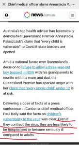 去年,总理莫里森和财长费登堡都曾说过小孩不会感染,今年还都说感染也不会得重症,而新州州长去年圣诞节更说12岁以下小孩不被传染也不会传染其他人,统统是睁眼说瞎话的主。反而昆州工党州长说小孩有危险,却被Australia Chief Medical Officer反驳。
