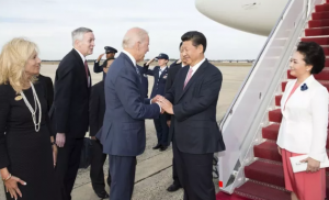 题图:2015年9月中國國家主席習近平(右二)偕夫人彭麗媛抵達美國華盛頓國是訪問,時為美國副總統的拜登與夫人到機場迎接。