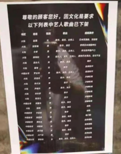 這幾個月以來内地整頓演藝圈、封殺「劣跡藝人」,網絡上還流傳著許多版本的劣跡藝人名單。最近更有網友在微博上爆料,去KTV點歌才發現很多歌都不能唱,當中包含台港歌手周子瑜、蔡依林、盧廣仲、羅志祥、柯震東、許志安、趙薇、張哲瀚、高曉松、吳亦凡、霍尊、房祖名、陳羽凡及陳翔等47人,估計共有1,376首歌在KTV被下架。