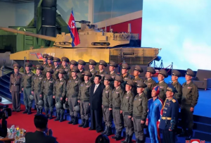 韓媒報導,《美聯社》12日公開朝鲜國防發展展覽會上的一張照片,一名身穿亮藍色緊身衣、頭上戴著一頂紅藍相間尖帽的男子,站在金正恩及一群表情嚴肅、穿著土色軍裝的軍人中,吸引了南韓網友們的注意,引起熱烈討論。