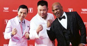圖- 被國際刑警通緝的內地商人施建祥,近日在美國被捕。圖為2015年6月13日,在上海國際電影節開幕紅氈儀式上,施建祥(中)與香港武打明星甄子丹(左)及美國拳王泰臣(右)一同宣傳《葉問3》。(網上圖片)