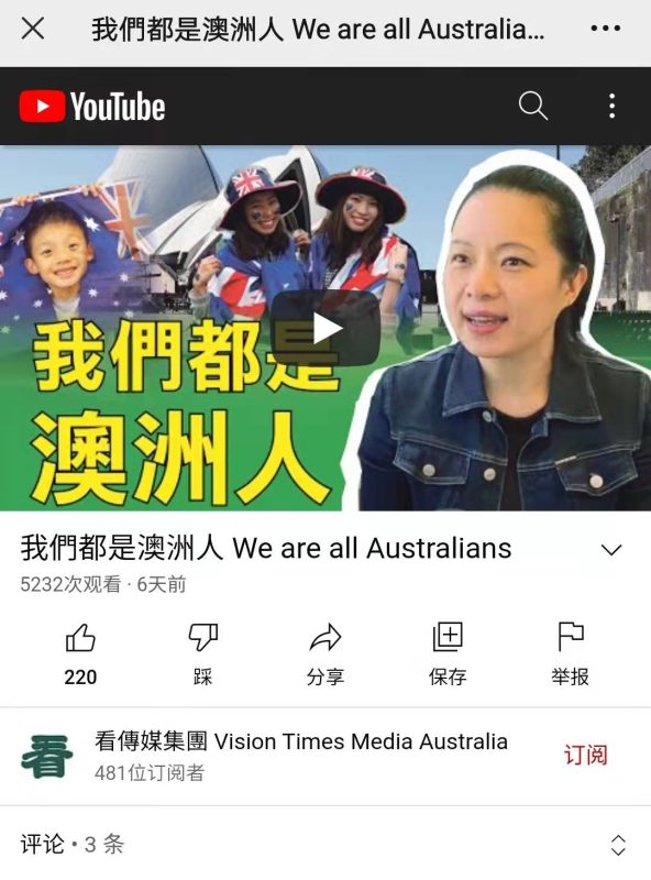 【爆料吐槽】近期,某媒体制作了一个“我們都是澳洲人 (視頻)”,据其宣传,“澳洲是一個多元文化社會,由於澳中關係出現轉折,尤其疫情完全打破了澳洲人的生活及工作習慣,那居住在澳洲的華人是否受到影響呢?我們走訪了悉尼北區華人聚集地之一的前威樂比市市議員Christine Tuon(童伊品女士)”。