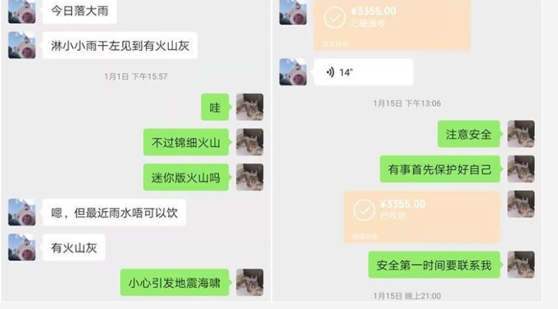 李女士與丈夫最後一次微信聊天,在15日13時01分。丈夫給她微信轉來了3355元(人民幣,下同),隨後發來一條語音:「火山爆發,海嘯要來,我現在去機場。」之後無論李女士再說些什麼,對方都沒有回應。